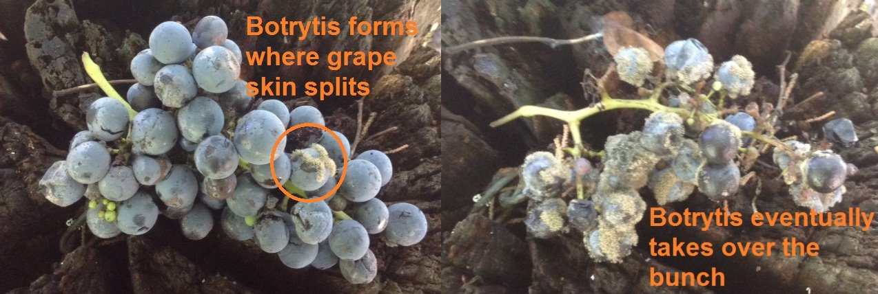 The berries within the bunches swelled, split and burst and then shrivelled. Expressed juice is open invitation for botrytis and there was quickly evidence of it.